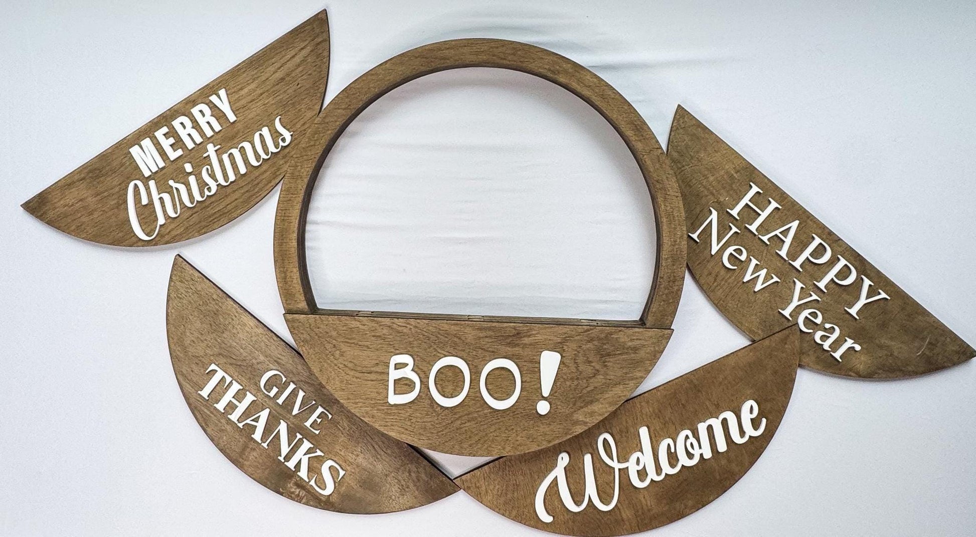 Switch up your décor with these magnetic interchangeable greetings, designed to fit perfectly on my round wreath bases and interchangeable signs. Each greeting plate is handcrafted from wood, laser cut, and stained for a clean, bold look that instantly refreshes your display.