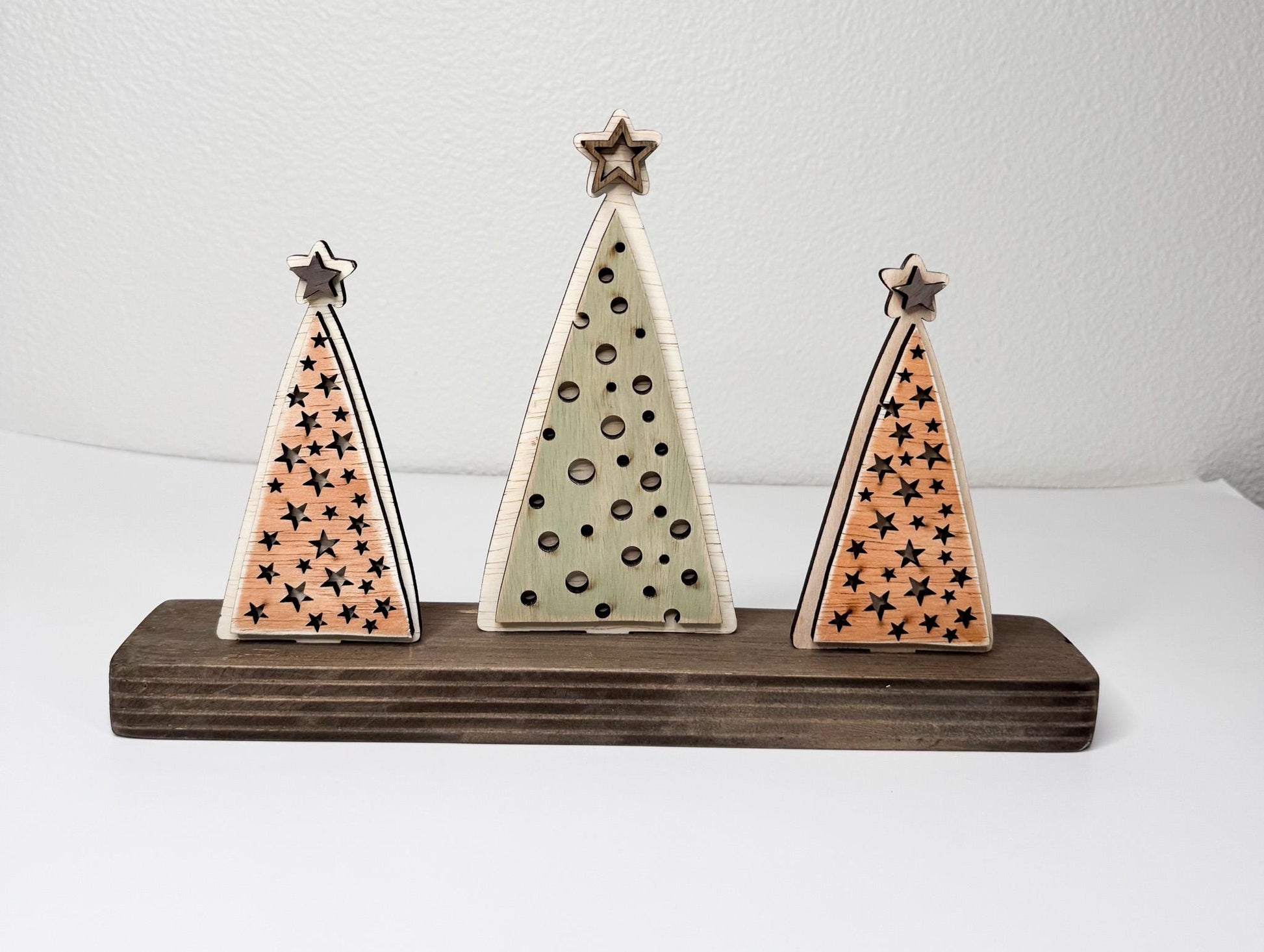 Bring warm, understated holiday charm into your home with this Rustic Christmas Tree Bundle, featuring three subtly styled wood trees and a coordinating wood shelf-sitter base.